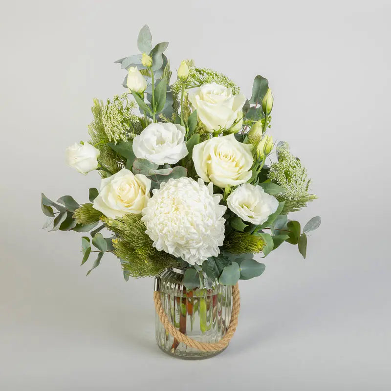 WHITE A bouquet well suited to any taste, combines seasonal white and green blooms with fresh white roses. This bouquet includes at least one white peony-mum, and fresh white roses, with stylish wrapping.