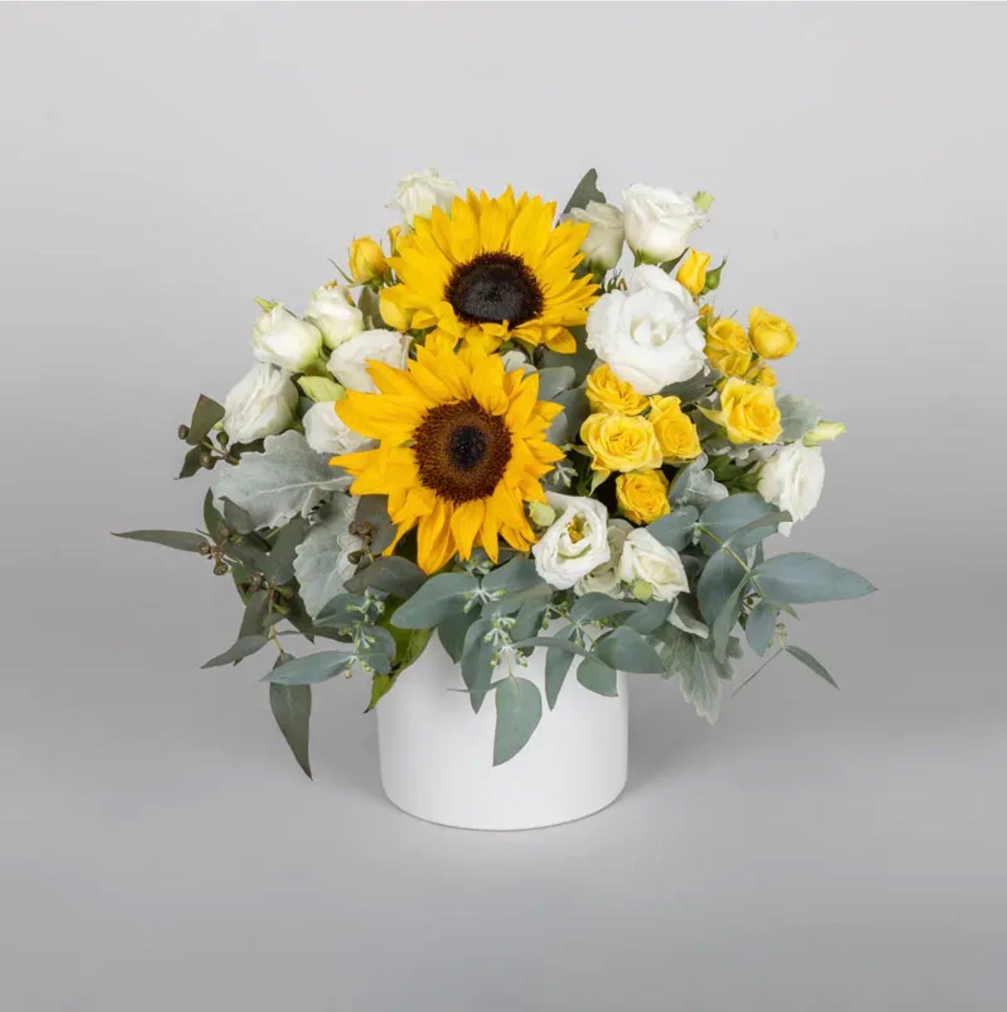 The floral arrangement is designed in a box or bouquet, features a combination of sunflowers, and seasonal white and yellow blooms. A perfect gift for brightening up or for a special occasion.